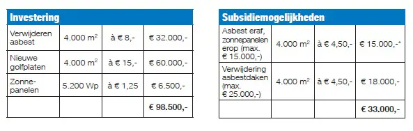* Omdat de subsidieregeling Asbest eraf, zonnepanelen erop is gemaximaliseerd tot een bedrag van € 15.000,- komt ‘slechts’ 3.333 m2 voor deze regeling in aanmerking. Na ontvangst van de volledige subsidiemogelijkheden blijft er een totale investering over van € 65.500,-
