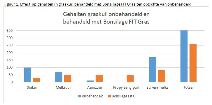 Specifiek aan Bonsilage Fit Gras is dat de combinatie en verhouding van Lactobacillus Buchneri, Plantarum en Rhamnosus ervoor zorgen dat een grotere hoeveelheid aan suikers en melkzuur worden omgezet in een hoger aandeel azijnzuur en propaan 1,2 diol (propyleenglycol). In figuur 1 is duidelijk het effect van Bonsilage Fit Gras te zien.