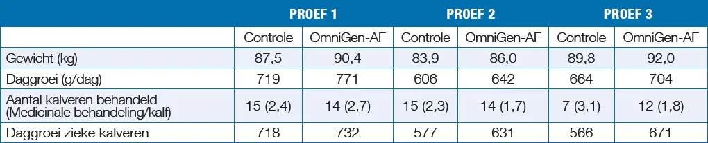 Dat OmniGen positieve effecten op de kalvergroei heeft, werd bewezen in alle proeven. Gewichtsverschillen waren telkens al zichtbaar na twee weken. Kalveren die via de melk OmniGen verstrekt kregen waren na acht weken drie kg zwaarder ten opzichte van de controlegroep. Het gewichtsverschil dat in deze periode gerealiseerd werd, was eveneens terug te vinden op slachtleeftijd (237 kg versus 240 kg geslacht gewicht). Dit is een schitterend resultaat, wat enkel en alleen te verklaren was door de toevoeging van OmniGen via de melkvervanger in de eerste acht levensweken.