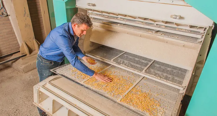 Samen lopen we door de fabriek. Het valt op hoe gedreven hij is. Handig tilt hij de luiken van de silo’s op om persoonlijk te kijken hoe het met de grondstofvoorraad staat. Overal kijkt hij in en achter om het volgende moment aandachtig te luisteren naar de geluiden van de machines. “Als ik dan soms een van de persen hoor huilen of janken, dan weet ik dat daar even extra aandacht aan moet worden besteed.” Hij doet zijn ronde vlot en secuur, maar bij zijn collega’s van de productie blijft hij wat langer staan. Ze praten elkaar even bij terwijl ze de zeef van de schoner verwisselen en het geschoonde graan controleren. “Die eerste uurtjes van de dag zijn heerlijk. Ik kan dan, zonder gestoord te worden, een goed beeld krijgen van hoe het er in de fabriek voor staat, voordat het om 8.00 uur druk wordt.”