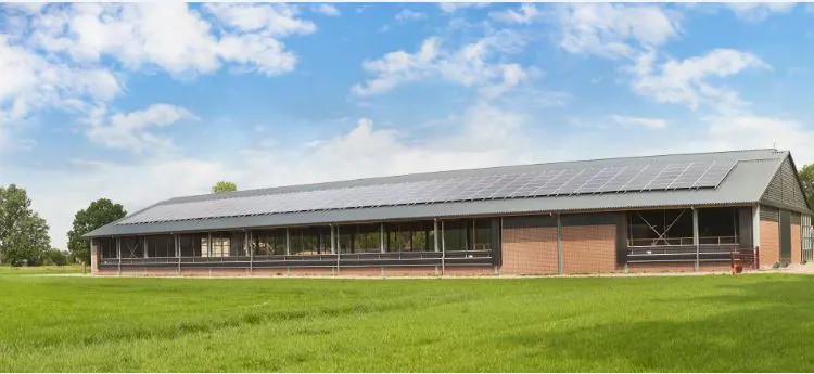 Om een stalgebouw in te passen in de omgeving dienen kleuren van de bouwmaterialen en verhouding tussen hoogte, lengte en overstek goed op elkaar afgestemd te worden. Ook het aanzicht van de zichtgevel vanaf de toegangsweg dient esthetisch verantwoord te worden opgezet om een rustige aanbik te verkrijgen. De juiste uitstraling van het bedrijf naar de nabije omgeving heeft Pieter er toe gebracht om de topgevel te voorzien van potdekselprofiel en de zijgevels van een afdekking voor het opvouwbare windgordijn. Ook geeft de antraciet kleur in combinatie met rood metselwerk een rustiek beeld waardoor het gebouw, in combinatie met de nog te aan te leggen beplanting, prima op kan gaan in de omgeving. Het plaatsen van zonnepanelen op een dakvlak wordt vaak als storend ervaren. Pieter is er in geslaagd om de verdeling van de panelen zodanig te kiezen dat de circa 400 m2 zonnepanelen in een juiste verhouding met de lengterichting zijn aangebracht aan de zuidzijde van het dak. De energieopbrengst bedraagt circa 50.000 kWh. en voorziet daarmee volledig in de energiebehoefte van het totale melkveebedrijf.