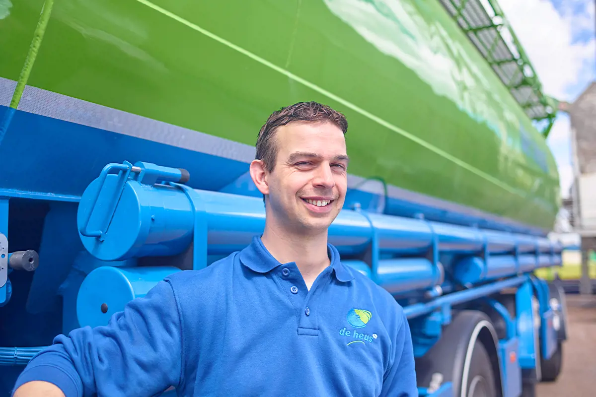 “Ja, bulkwagenchauffeur worden was absoluut mijn droom! Ik ben op mijn 18de begonnen in de bouw, maar in de avonduren heb ik toen mijn vrachtwagenrijbewijs gehaald. Mijn vader werkte al jaren voor De Heus en zo ook mijn broer, maar die wilde liever internationaal gaan rijden. Dus toen hij wegging werd ik benaderd of ik niet voor De Heus wilde gaan rijden en dat heb ik toen met twee handen aangegrepen. Het leukste aan dit werk is de afwisseling die je hebt. Je weet nooit waar je de volgende dag naar toe gaat en natuurlijk het feit dat je soort van eigen baas bent. Ook kom ik ook uit een agrarische nest, ik voel me verwant aan de sector. Je moet het ook leuk vinden om met zo’n grote bulkwagen te manoeuvreren op van die kleine landweggetjes en bruggetjes. Dan komt het echt neer op stuurmanskunsten, dat maakt het werk echt uitdagend.“