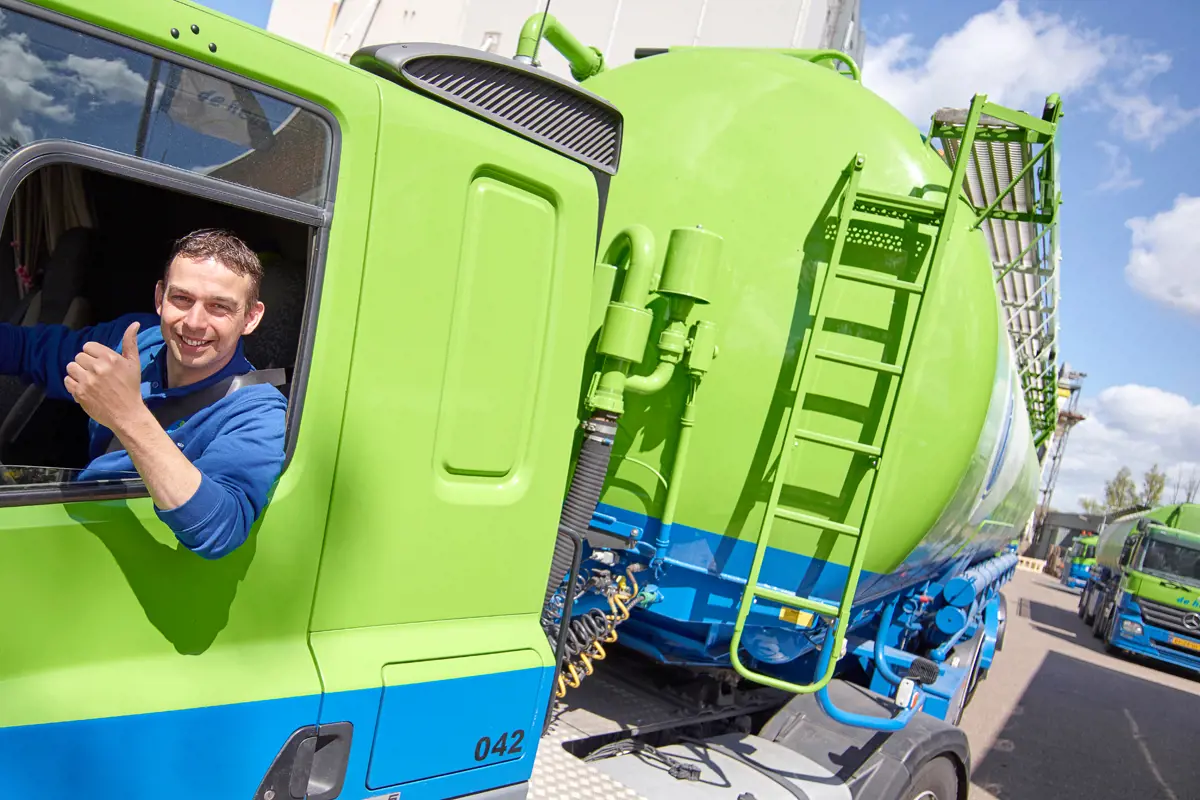 “Gemiddeld genomen los je een ton in twee minuten, dus bij een volle vracht duurt het lossen ongeveer één uur. Maar de ene silo staat verder weg dan de andere en je lost altijd compartiment voor compartiment, dus de tijd die je aan het lossen bent kan enorm verschillen. Het is altijd leuk als de klant even een praatje komt maken terwijl je aan het lossen bent. Soms krijg je zelfs een kopje koffie aangeboden of drink je samen met de klant een kopje koffie als je klaar bent met lossen."