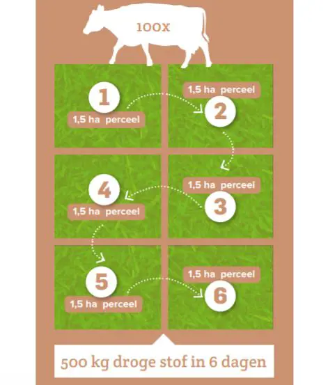 In dit voorbeeld werken we met een bedrijf met 100 grazende koeien. Er zijn dan zes percelen nodig van elk 1,5 hectare groot. Bij normale grasgroei in het voorjaar (80 tot 100 kilogram drogestof per dag) groeit er in zes dagen rond de 500 kilogram droge stof. Met deze perceelgrootte hebben koeien elke zes dagen een ‘nieuw’ perceel waar ze de hergroei weer naar binnen kunnen werken. Een dergelijk weideplatform is na de eerste snede voort te zetten op een zestal percelen van rond de twee hectare groot, om ook in de zomer voldoende grasaanbod voor de koeien te houden.