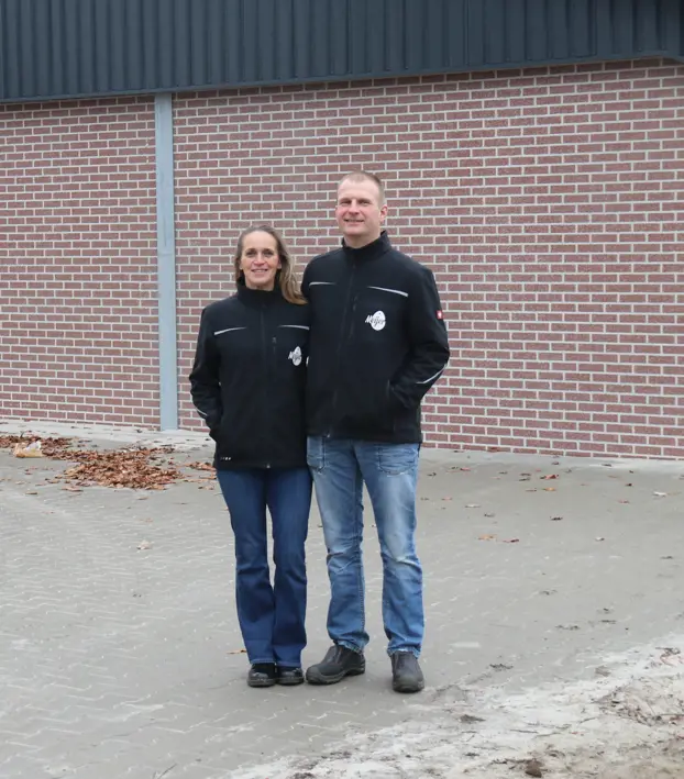 Arjan: “Toen we dit bedrijf in 2004 begonnen hielden we in twee stallen 40.000 legkippen en in een stal 35.000 opfokhennen. In 2006 hebben we brand gehad en hebben we een nieuwe stal teruggebouwd voor 39.000 vrije-uitloophennen waarmee we het aantal hennen in deze stal verdubbelden. We vonden het altijd mooi om hennen op te fokken. Alleen was de inventaris van de opfokstal 27 jaar oud en door het draaien van 2,5 rondes per jaar is het arbeidsintensief en onregelmatiger. Bovendien heeft de hygiëne ook een belangrijke rol gespeeld om te stoppen met de opfok. Als er jonge kuikens kwamen moest ik soms wel vijf keer per dag douchen. Daarom hebben we besloten om te stoppen met de opfok en er is een nieuwe stal gebouwd voor biologische leghennen.
