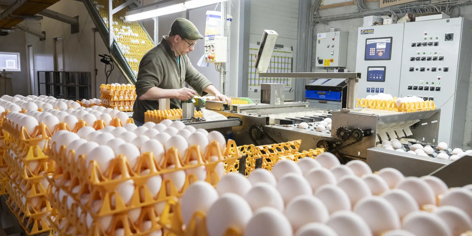 “Het strooisel is gelukkig ook in de herfst en winter altijd droog. Dit komt doordat de warme lucht uit de nok continu naar beneden wordt geblazen. Daardoor zijn de kippen én de eieren schoon. En dat vinden we belang rijk, want de eieren zijn natuurlijk wel ons eindproduct. We streven altijd naar kwaliteit,” vult Petra aan. Ook in de zomer is het klimaat trouwens goed doordat er extra ventilatie capaciteit is geïnstalleerd in de stal.