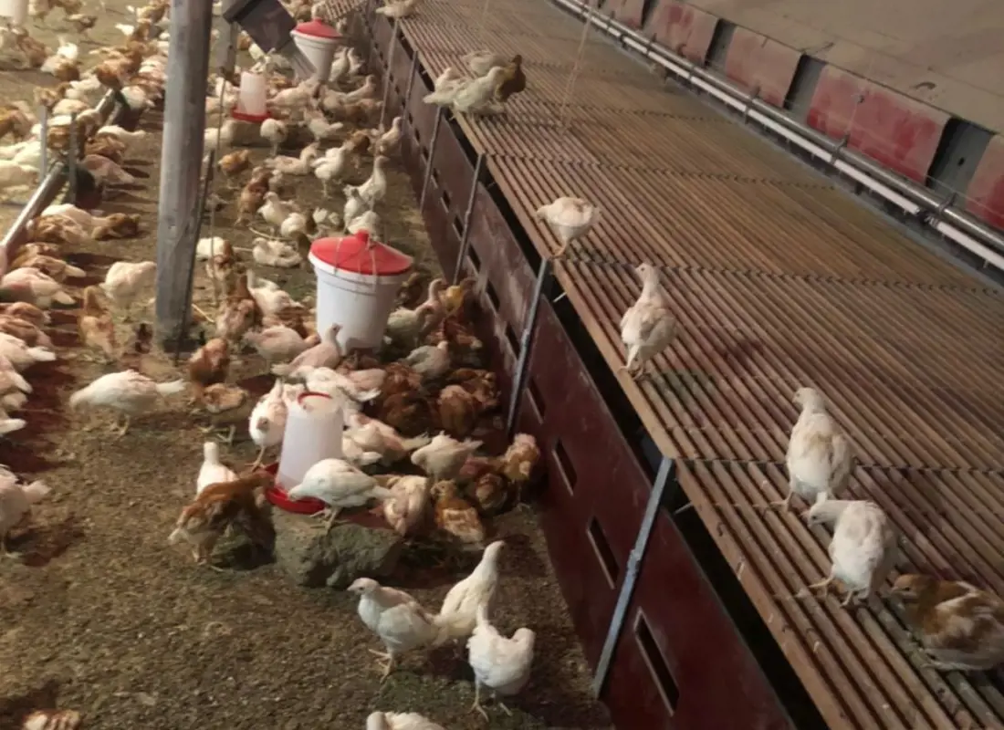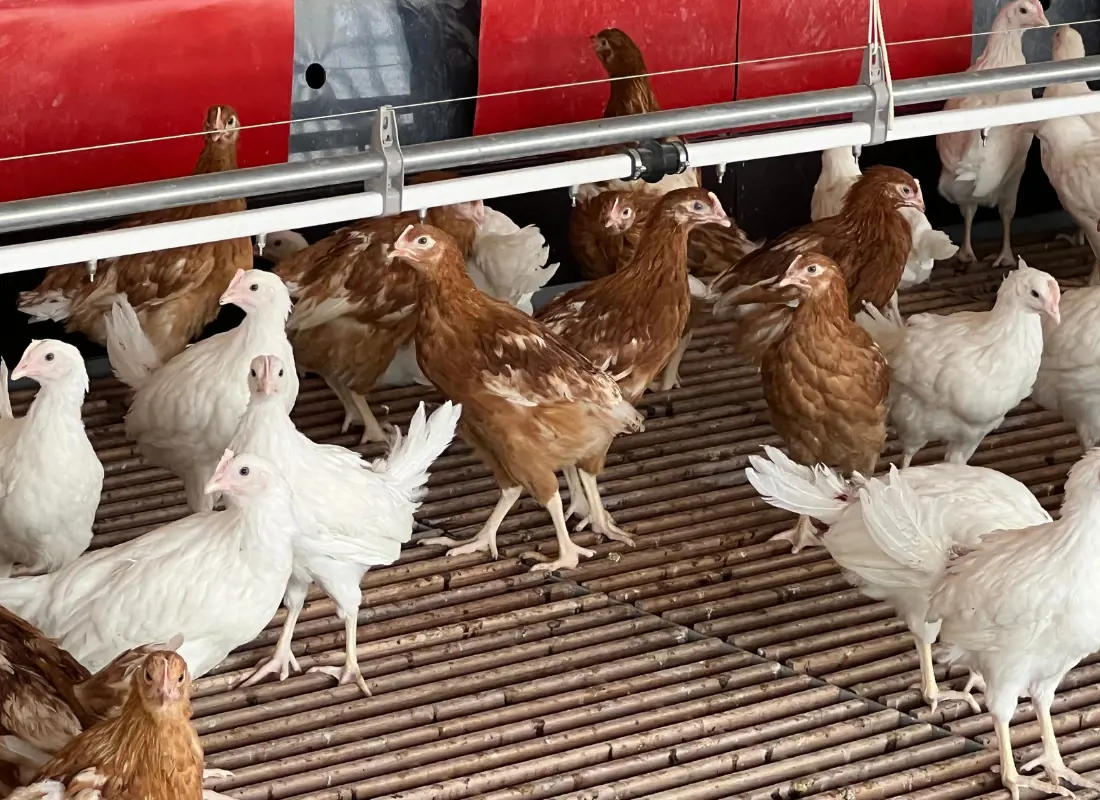 “We werken op ons bedrijf in Nederland met twee leeftijden, zodat we altijd eieren kunnen leveren“, vertelt Klaasjan. “Tot op heden hadden we cyclussen van anderhalf jaar en konden we altijd in mei of in oktober jonge legkippen opzetten. De dieren zijn echter zo duurzaam geworden dat dit niet meer lukt. We proberen nu de leeftijd van de witte kippen tot 100 weken te krijgen.” “We maken zelf ons voer. We kopen mais en tarwe in en halen de concentraten bij De Heus Voeders in Ravenstein of Nijkerk. We hebben 30 hectare grond om ons bedrijf liggen, maar een groot deel daarvan is in gebruik als uitloop voor de kippen.”