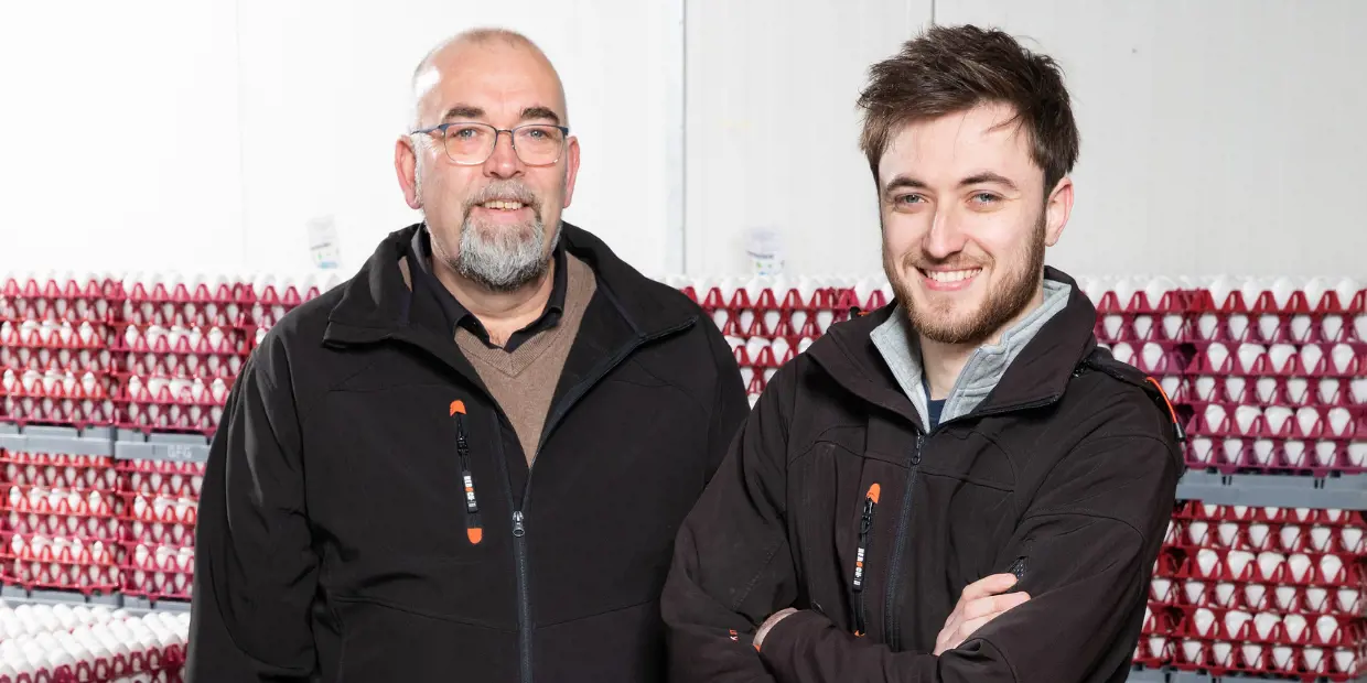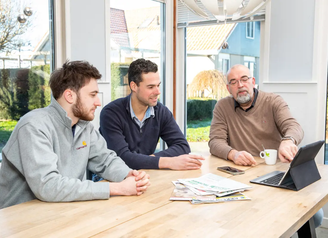 “De samenwerking met De Heus is hartstikke positief. Ik vind het belangrijk dat legpluimveespecialist Richard Bos (m), mijn zoon Mathijn (l) en ik elkaar scherp houden. Soms gaat het er even stevig aan toe”, lacht legpluimveehouder Klaasjan Salomons. “Ik werk het liefst samen met een commercieel contactpersoon die mij bij eventuele technische issues ook kan helpen. Ook spreek ik af en toe een productmanager over de samenstelling van het concentraat”.