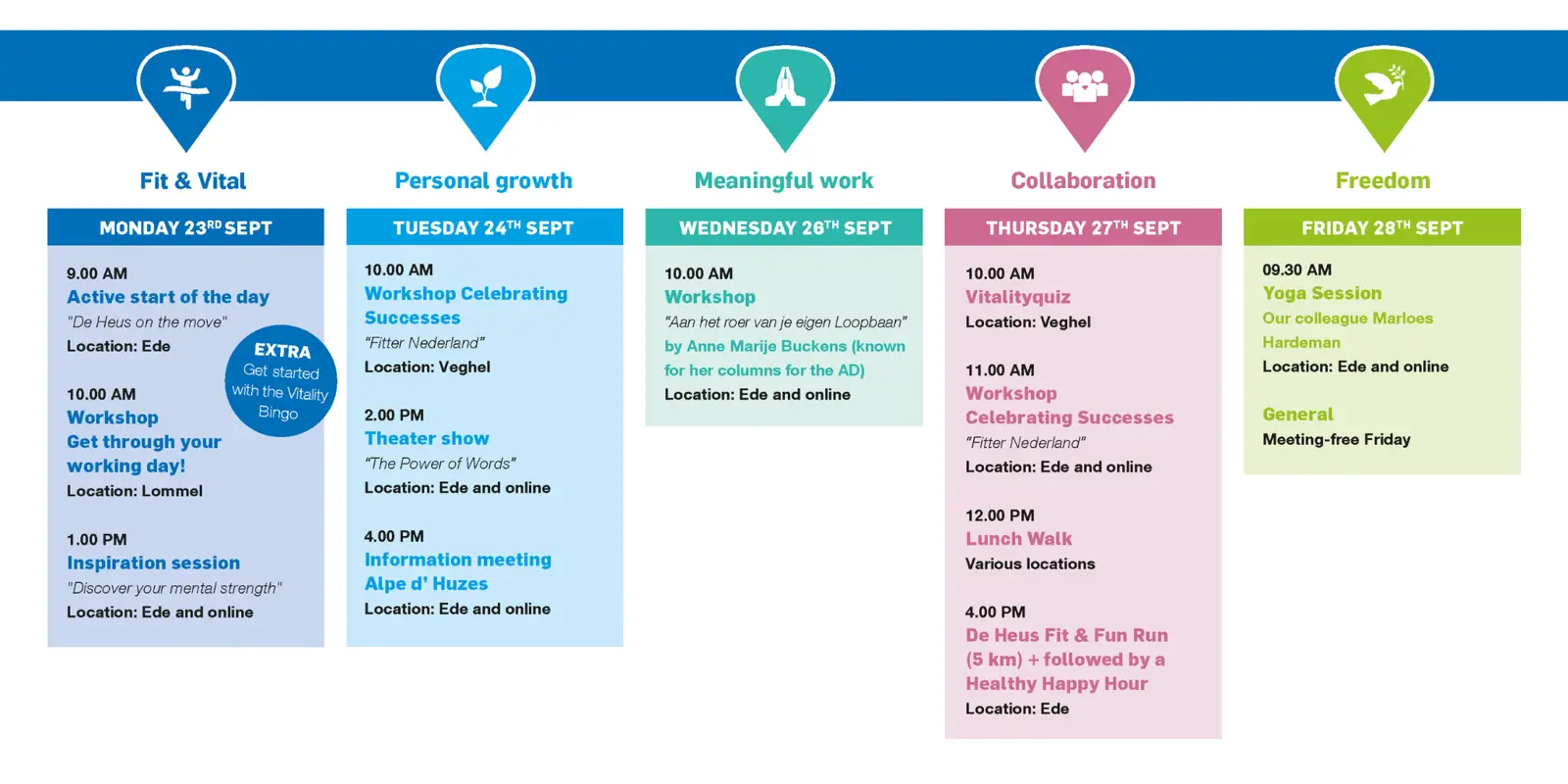 Join our activities, specially organized for you and your colleagues! From inspiring workshops to enjoyable lunch walks, there’s something fun for everyone! Get involved, and let’s make it a positive week together! Registration is open until September 20. Questions? Email us at: werkplezier@deheus.com