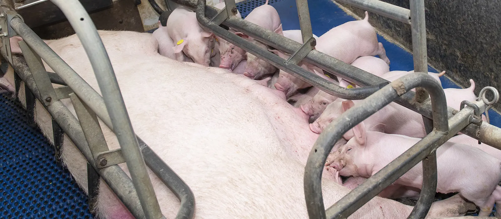 Mooie, gezonde en tevreden biggen die gezamenlijk drinken bij de zeug. Dit komt onder andere doordat de zeugen geleidelijk individueel gevoerd worden.