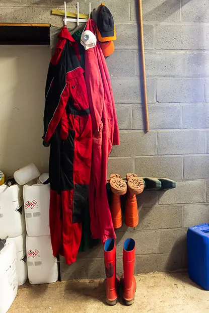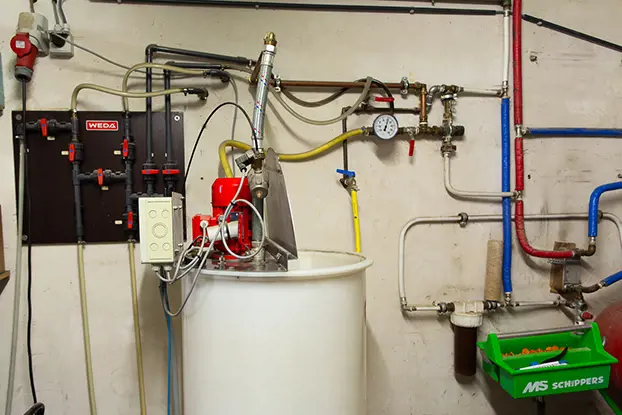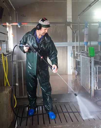 Alles draait in dit bedrijf om diergezondheid. Goede hygiëne is daarbij een voorwaarde. Elke ronde worden de hokken helemaal schoongespoten. Hier zie je vader Jean Paul in vol ornaat aan het werk.