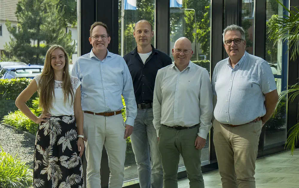 Het team van productmanagers voor de vleespluimveevoeders bestaat uit (v.l.n.r.) Iris Zweekhorst, Christiaan Buitink, Steven Borgijink, Gerry De Hertefelt en Jan Jonkers. Samen zijn ze verantwoordelijk voor het vleespluimvee-assortiment van De Heus Voeders. Iedere productmanager heeft een eigen specialisatie.